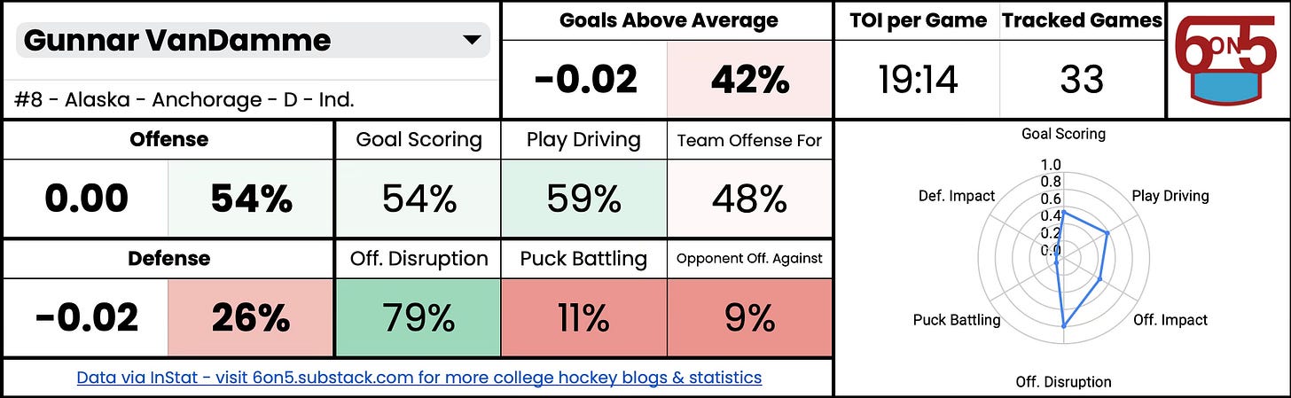 In terms of how he is as a player, VanDamme clearly has great skating ability and uses it well in transition. He loves to get in on the rush and be aggressive after opposition turnovers. While watching his shifts, I clocked multiple times where he ended up being the furthest forward player during a rush sequence.