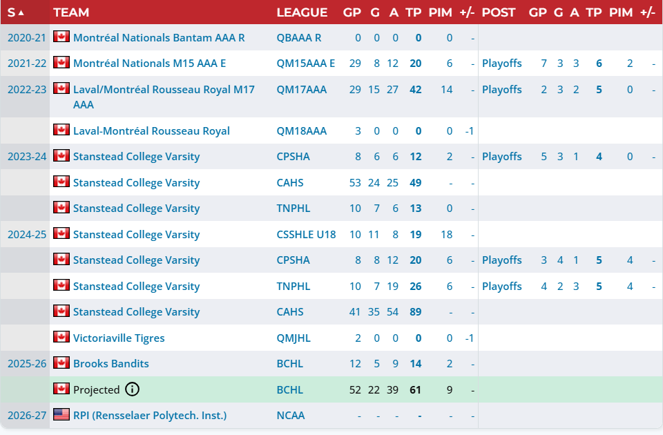 Kamyl will need some more time in junior hockey before coming to RPI, as he is still in his first full season at this level. Brooks is traditionally one of the best programs in Canadian junior for sending kids to the NCAA, but obviously this was before the CHL was allowed as a development path for college hockey. It is disappointing he didn’t make the Q this year, as he had an outstanding camp for Victoriaville yet was still cut. His most likely development path to RPI is a point-per-game year in Brooks, followed by a strong year in the Q next year before coming to RPI in 2027.