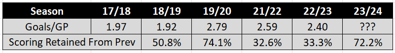 Therefore, 100% - 25.9% = 74.1% of the scoring was retained going into 19/20. That 19/20 team scored nearly a goal per game more than the 18/19 team.