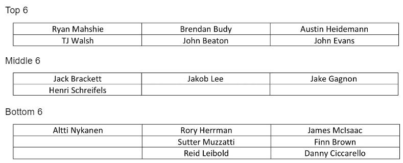 Based on what we knew going into the season, I was comfortable with that roster. Retroactively, you would move Brackett and Schreifels to bottom 6, swap Budy and Muzzatti, swap Lee and Beaton, and swap Evans and Gagnon.