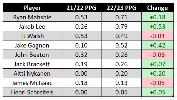 S: If you could point to just one thing, I’d probably lean towards inexperience and the lack of returning key players. Even though the 21-22 team had less returning scoring than this year, they had more players who had played key roles coming back. Linden, Leppanen, and Dubinsky had all played in top 6 roles before and were back. Sellar and Addamo had played top 6 roles at their previous schools. Johnson and Kjellberg had been top 4 guys before, and Baxter brought in 116 games of experience and had been top 4 some of the time at Lowell. By contrast, this year’s team only had Mahshie and Walsh with experience in top 6 roles with Heidemann joining them from the portal. Only Agnew had top 4 experience on the blue line. That matters.