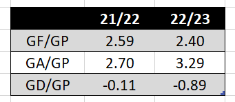 B: One of the most stark differences between the 21/22 season and the 22/23 seasons was the number of goals conceded per game:
