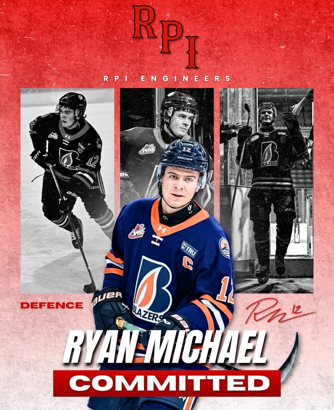 RPI earned a commitment from Kamloops Blazers captain Ryan Michael back in January, as Eric Lang’s defensive overhaul continues to take shape. Michael’s commitment marks the continuum of a strategic shift into the WHL by the staff. Lang has spoken at length about wanting players with “hard skill”, and Ryan Michael fits that to a tee. He plays a highly reliable game and is well-known for his leadership qualities, with size and stick skill to go with it.
